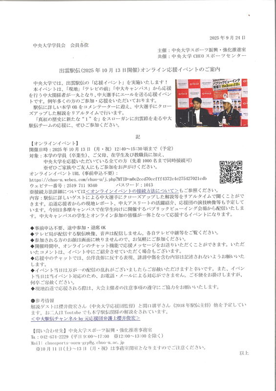 中央大学スポーツ振興・強化推進室より、標記の件について学員会各支部へ